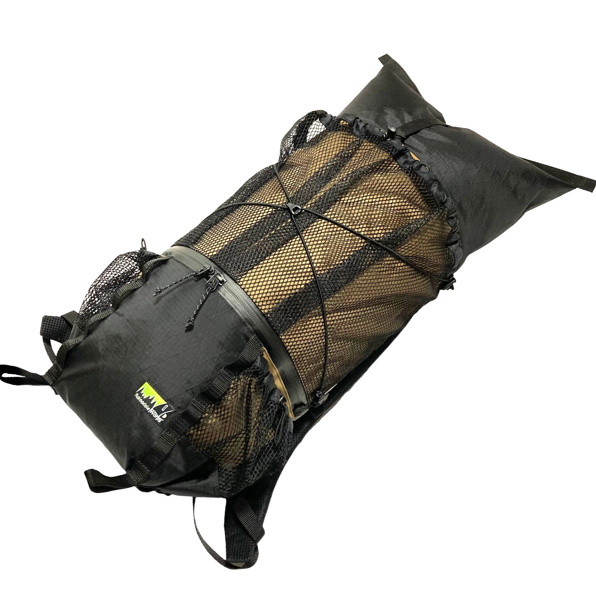 吹き流し部(ロールトップ)の巻き方次第で、内容量の調節だけでなくフォルムも自由自在と変えることができます。最大限ギアを詰めればサクサク動くファストパッキングや無雪期のオーバーナイトハイク、吹き流し部を巻ききればコロっとした愛おしいフォルムで、デイハイクから普段使いまでマルチに活躍します。
